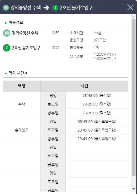 | 공휴일 | 상행 | 5:33:00 | 수서 | 대화 | 22:38:00 | 오금 | 대화 |