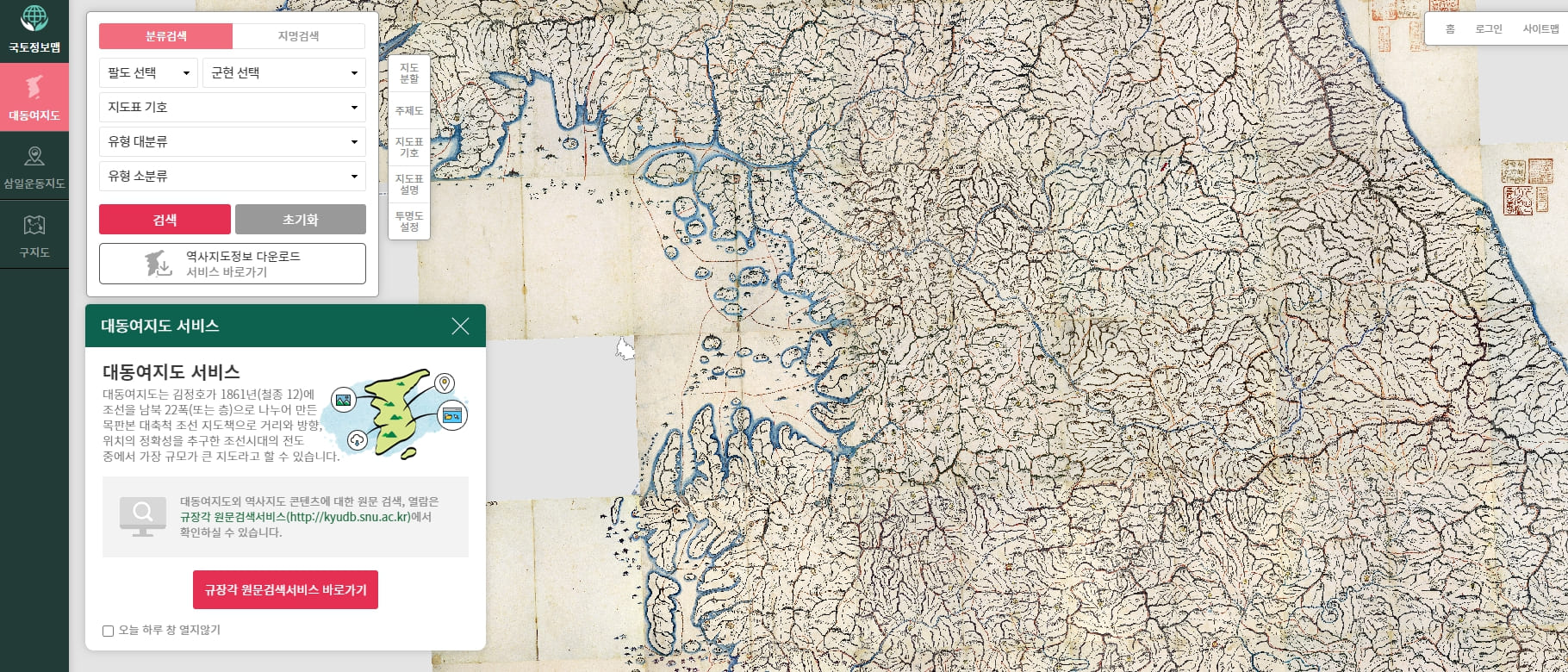일반적인 지도 이외에도 국토지리정보원에서는 아래와 같은 역사지도 정보를 제공중에 있습니다. 대동여지도 및 삼일운동지도, 시대별 지도 변천사를 볼 수 있는 구지도를 제공 중에 있습니다.