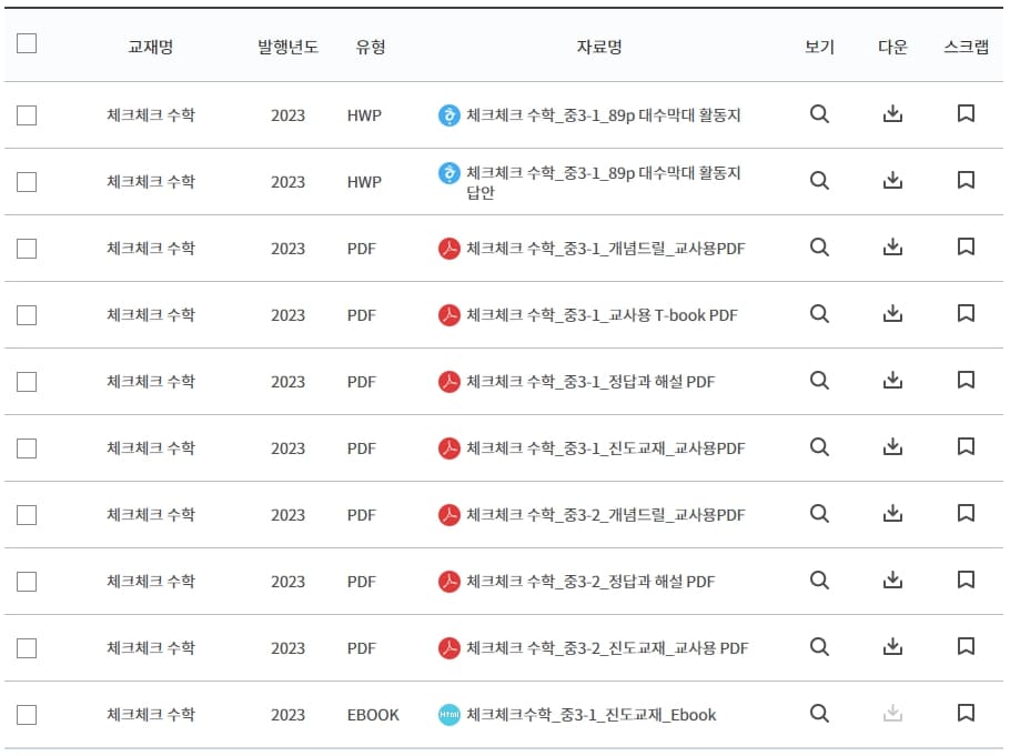 5. 체크체크 수학 중3-1 관련자료 선택후 다운로드