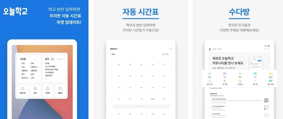 간혹 사용기기 환경에 따라 컴시간 알리미가 정상 작동 하지 않을 수도 있습니다. 이런 경우라면 스트레스 받을 것 없이 동일한 기능을 제공하는 다른 어플을 추천드립니다. 오늘학교라는 어플인데요. 해당 어플에서도 학교 반 정보만 입력하면 시간표 외에도 급식 정보등도 확인이 가능합니다.